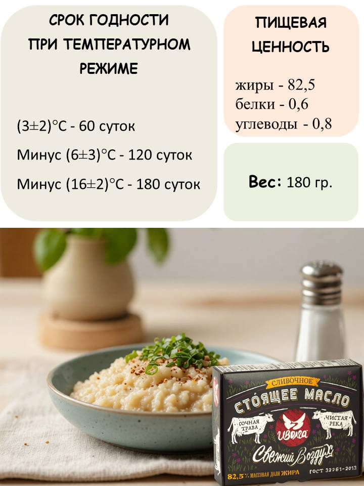 Сливочное масло «Иволга» — продукт премиум-класса, приготовленный из отборных свежих сливок лучших экологичных ферм Ивановской области. Отличается насыщенным вкусом и приятным натуральным ароматом свежего молока. Высококачественное сливочное масло марки «Иволга» производится исключительно из натурального сырья, без искусственных добавок и консервантов, соответствует высоким российским стандартам качества. Продукт имеет традиционную высокую жирность — 82,5%, что обеспечивает его идеальное использование в домашней кулинарии и ресторанных блюдах.