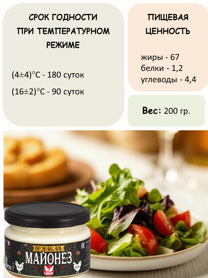 Майонез «Иволга» — мягкий и воздушный соус, идеально подходящий для салатов, закусок, выпечки. Содержит полезные жиры, витамины А и Е.